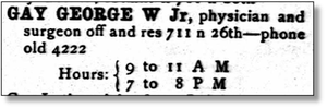 His work may have put him at bigger risk of becoming sick than that of others might: In 1903, Gay was reported ill “all the week,” and was reported again in 1925 as having improved “slightly” and “will recover” after “another” serious illness.[27] The biggest crack in a seemingly robust life, however, was in October 1932, when he was 52 and he underwent two surgeries described as “major operations.” He spent two months convalescing. Even so, he made sure the papers announced in November he had resumed his medical practice “at his office at 2720 East Broad.” [28]