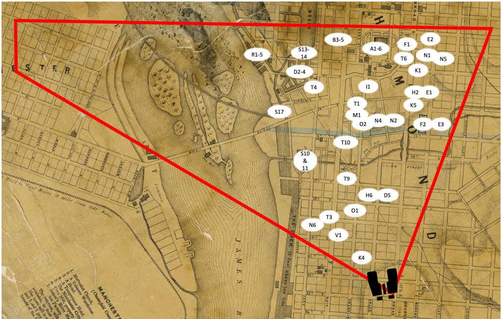 Below: Detail of “Plan of Richmond, Manchester, and Springhill” (1848) by Charles S. Morgan. The red lines on the detail indicate the approximate field of vision of the 1850 lithograph although the lithograph has an altered perspective. The original map has indicators of prominent buildings; the map detail below with the red outlines shows the same indicators, but they have been placed in white circles to make them easier to read. The original map also had a legend with the names of the buildings which, for the below section inside the red outlines, follow underneath. The legend on the original map contains additional details about the buildings which are not provided here. Sources: Richmond map: Charles S. Morgan, 1848, acquired online from the Library of Virginia. Lithograph of Richmond: E. Sachse & Co., c. 1850, acquired online from the Library of Congress.