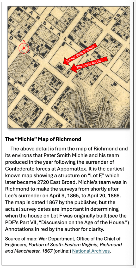 Because of the lack of other evidence, the map takes on an outsize importance as to a possible date of construction of the original footprint of the house at 2720 East Broad. It is often referenced as a “Civil War” map of Richmond, implying that it was produced during the conflict. If that were the case, then the presence of the structure (see sidebar) indicated by the small black rectangle, on what was Lot F and what would become 2720 East Broad, would indicate it was built before the end of the war, even, potentially, long before the end of the war. But, of course, U.S. Army cartographers did not enter Richmond to begin the official surveys for this map until around April 24, just after the Confederate surrender at Appomattox on April 9, 1865.