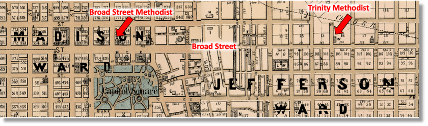 The story of Trinity Methodist and the older, similarly-constructed Broad Street Methodist is sometimes confused in historical accounts because both churches were built in Richmond around the time of the Civil War, both were located on Broad, and both were designed in the popular Italianate style by noted Richmond architect, Albert L. West (Figure 1). The two churches trace their roots to 1790, when the first congregation of Methodists in Richmond organized a Sunday School at the foot of Church Hill. Trinity, at East Broad and 20th Street, is today New Light Baptist Church. Broad Street Methodist – across from the capitol building at East Broad and 10th, part of today’s Virginia Commonwealth University’ Children’s Hospital – was torn down in the 1960s. That two large Methodist churches “could flourish [in the mid- to late-1800s] just 10 blocks apart” (Figure 2), was “indicative of how densely populated pre-electric streetcar Richmond was,” notes a 2014 account of the history of the two congregations.[2]