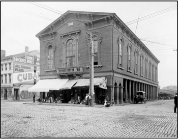 At the close of the war, construction on Trinity Methodist Church was resumed, with Richmonders William Liggon and Joseph Newell as the contractors.[4] Newell, who had been in Richmond since at least February 1848, started his career modestly as a carpenter but had become known as a builder of much bigger projects very quickly, notably the 1854 addition of a second story to the old First Market at Main and 17th streets. A photograph of the building shows that the second story was nothing if not voluminous, with wall heights that appear to be some 20 feet tall (Figure 3). Meant to be utilized as a community meeting hall, it was so striking when completed – the walls and ceilings were frescoed with “beautiful little birds” painted on them – that there was controversy over who should be allowed to use it.[5]