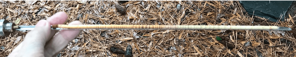 This is the actual sample taken from Matt and Pam’s tree. At the end of the right side (you can’t see it too well) is a full circle which shows the first year of the tree; from there to the left there are just single lines which show the age of every year. The first 30 or so years, the lines are further apart as the tree grows quickly; then as it gets closer to its maximum height, growth slows down. So the lines are much more frequent on the left (closer to the outer side of the tree) than on the right.